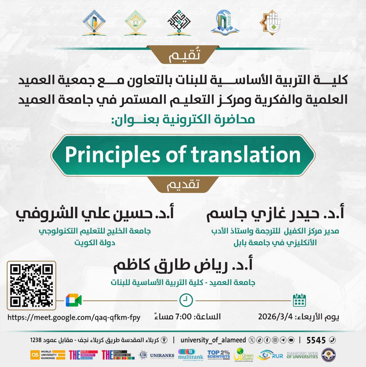 The College of Basic Education for Girls, in collaboration with "Intellectual and Scientific Society of Al-Ameed”, (AlKafeel centre for translation” and “ Continuing Education Center at Al-Ameed University”, conducted a virtual lecture titled "Principles of Translation" on the evening of Wednesday, March 4, 2026, via the Google Meet platform.